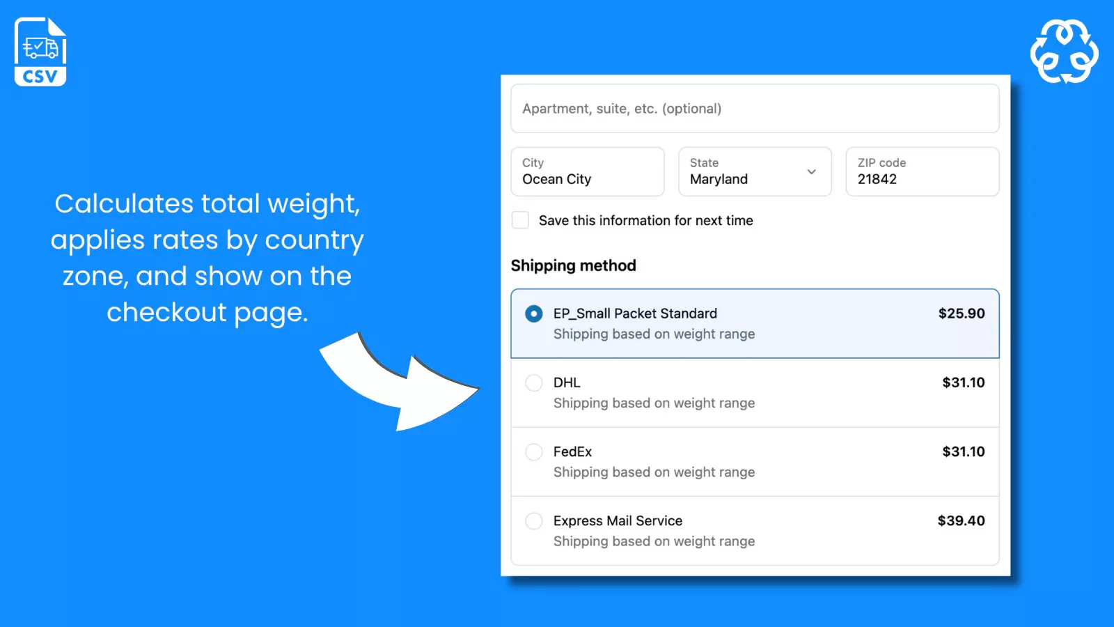 Easily define shipping types, rate ranges, or minimum/maximum values. Once your data is uploaded, the app instantly applies your rules during checkout to deliver the correct rates before your customers place their order.