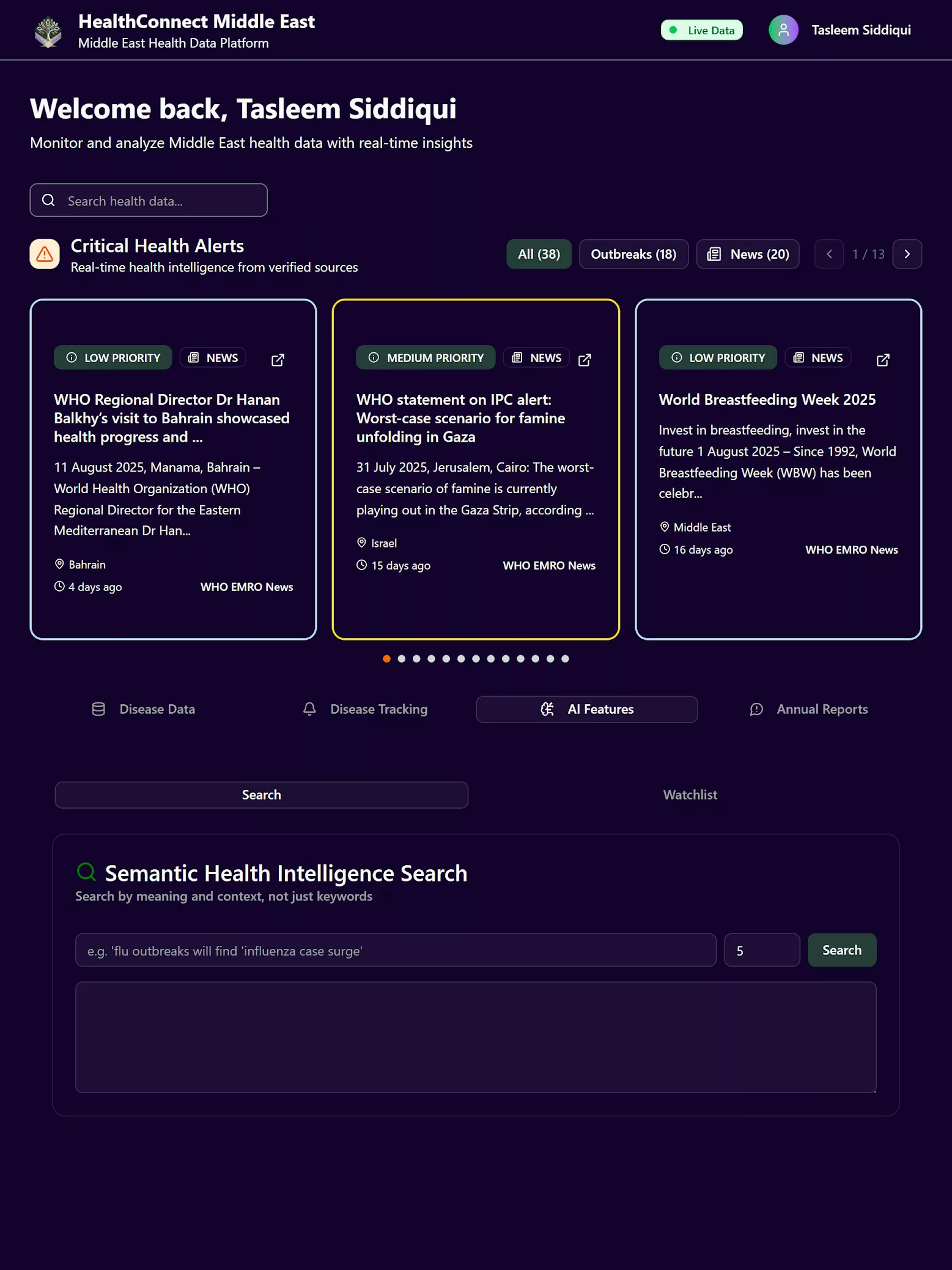 With AI-powered features, HealthConnect can analyze patient data, provide smart recommendations, and assist healthcare professionals in offering precise care. The platform focuses on secure data management, patient-doctor interactions, and healthcare workflow optimization, tailored for the Middle East region.